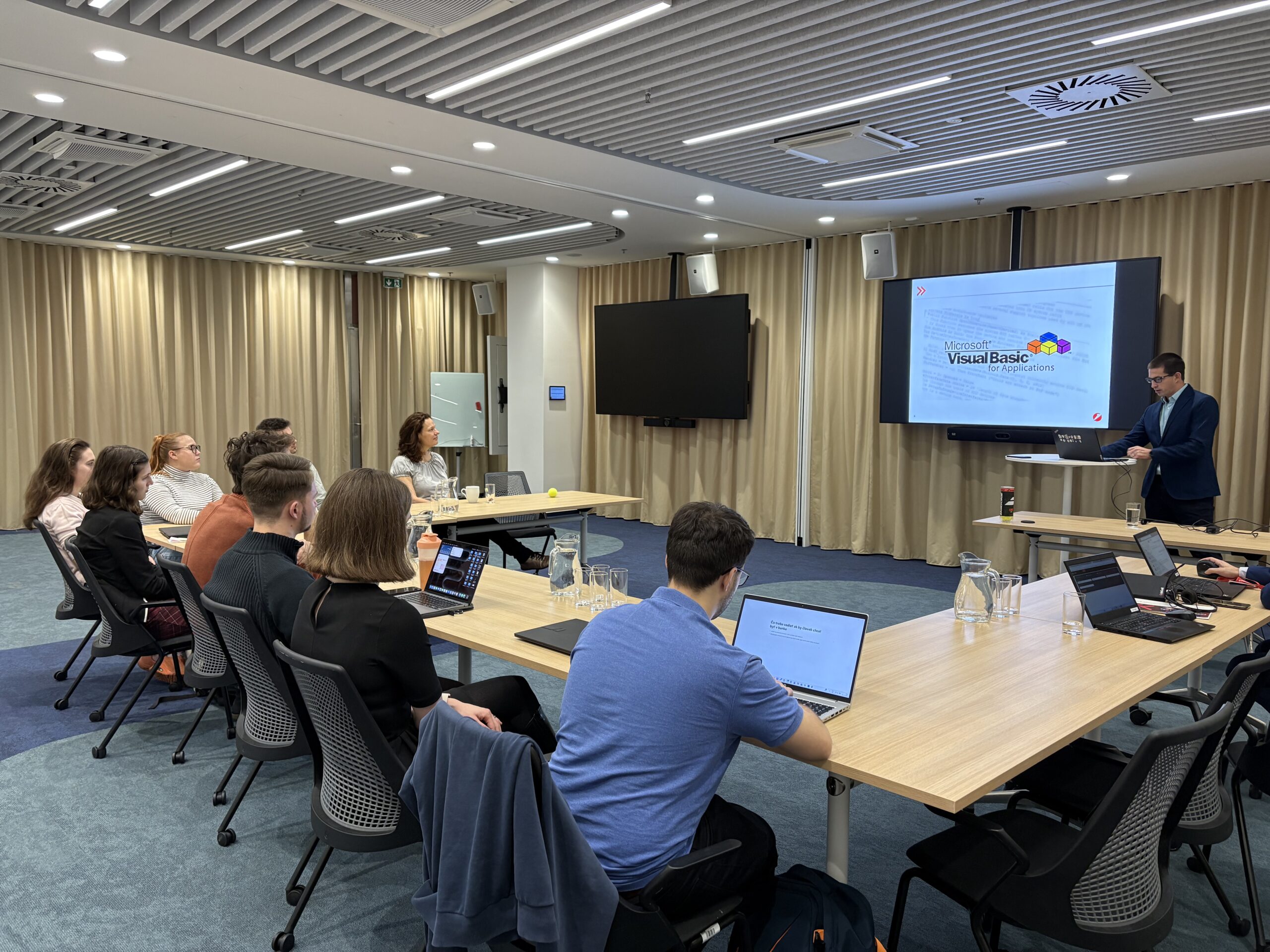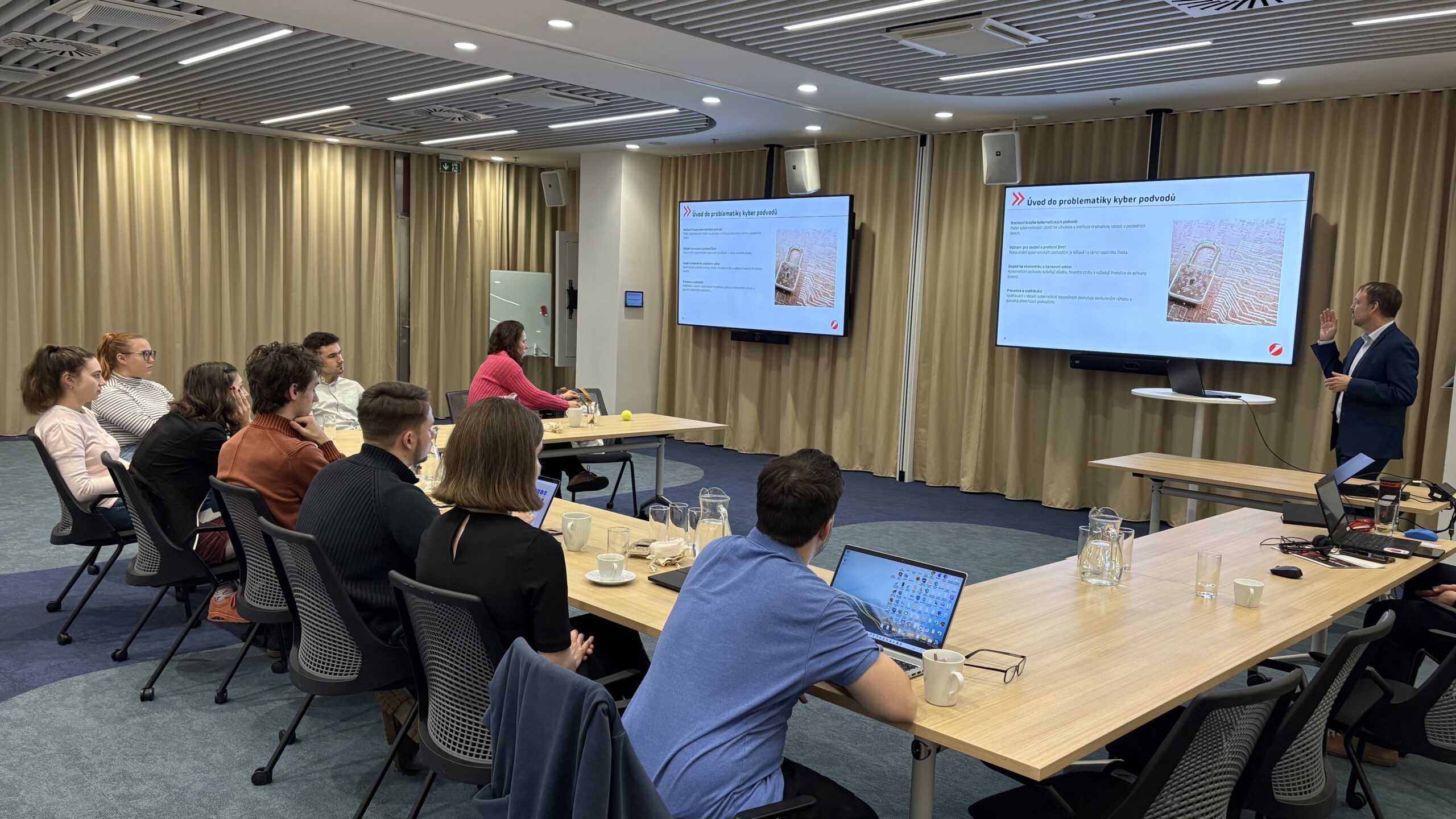 Adam Kilián studentům představil možnosti automatizace a využití programovacího jazyka Python při zefektivňování práce napříč bankou. Vojtěch Hájek se následně zaměřil na problematiku podvodů, jejich aktuální podoby, ochranu banky i psychologii obětí.